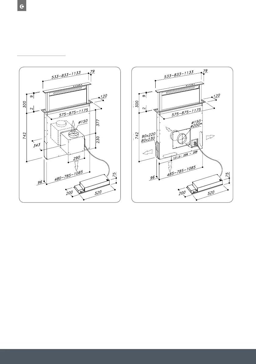 Note: The Downdraft worktop cutout can be connected to the hob cutout,