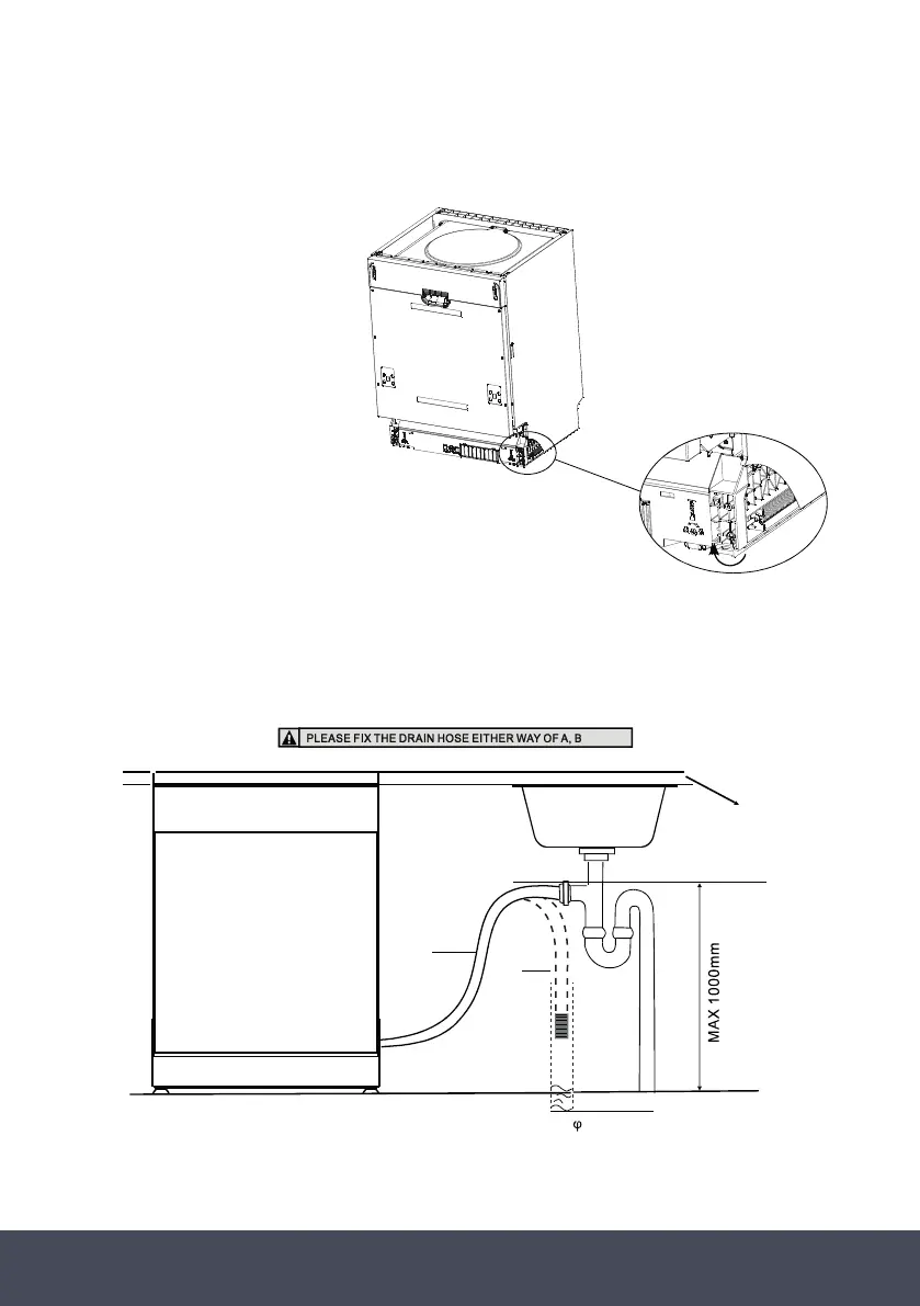 Insert the drain hose into a drain pipe with a minimum diameter of 40mm, or let it run into the sink, making sure to