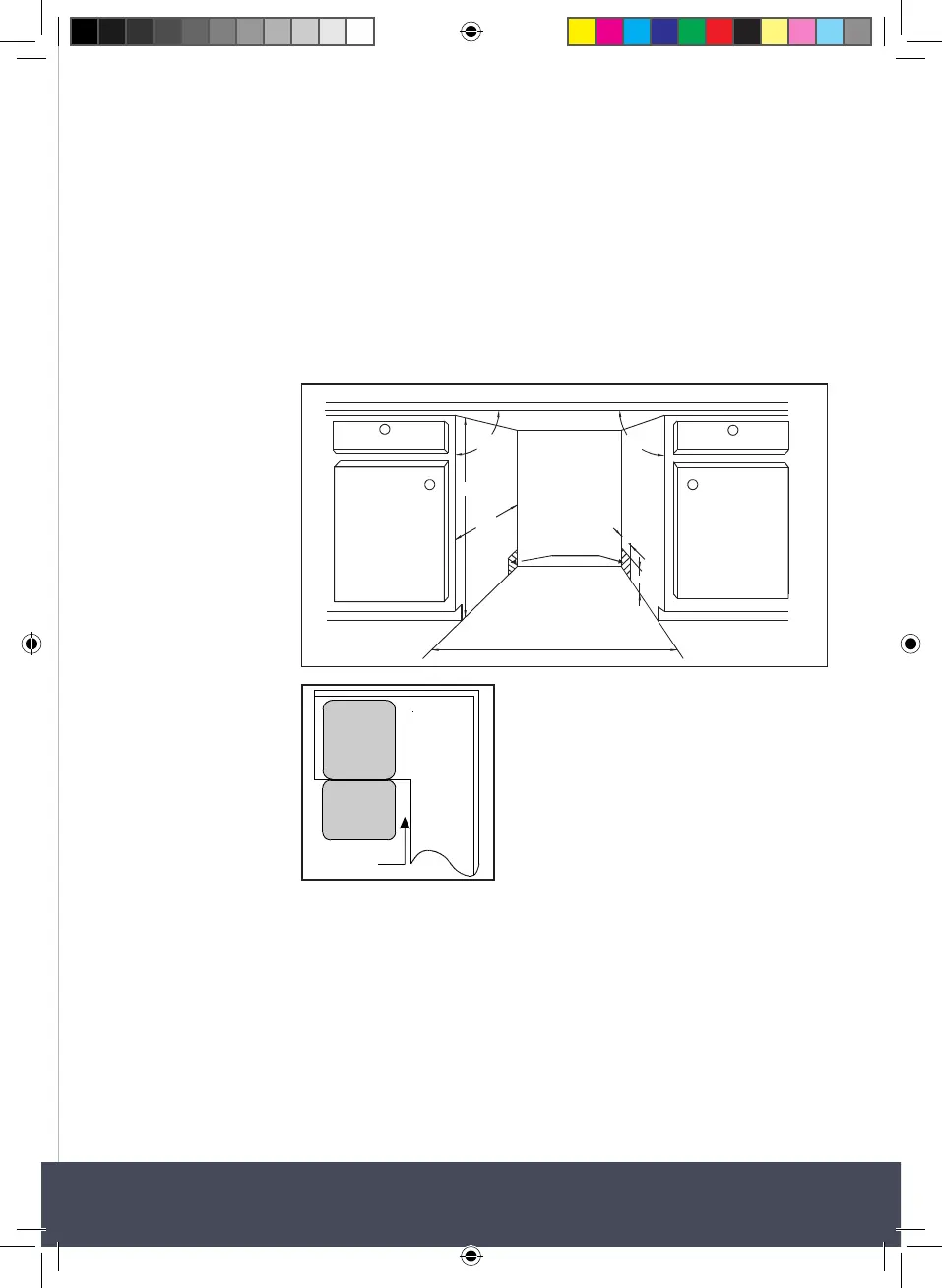 Illustrations of cabinet dimensions and installation position of the dishwasher.