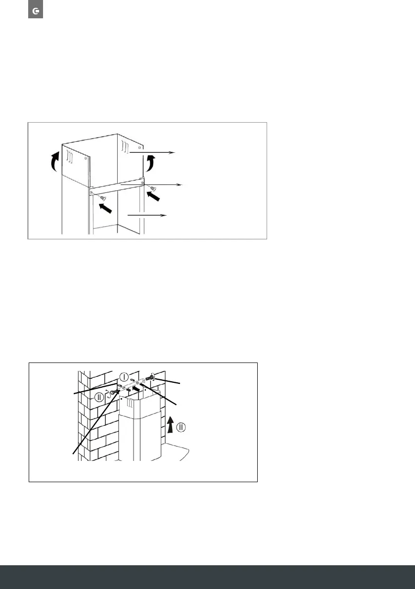 Put the chimney on the cooker hood. Fix the lower chimney bracket on the wall by 2 screws