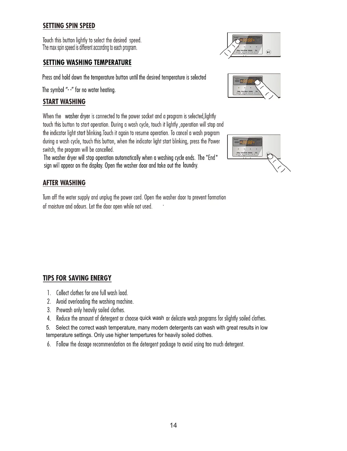 Caple WDi2203 - OPERATIONAL GUIDELINES; SETTING WASH AND SPIN PARAMETERS; STARTING AND COMPLETING CYCLES; ENERGY SAVING RECOMMENDATIONS