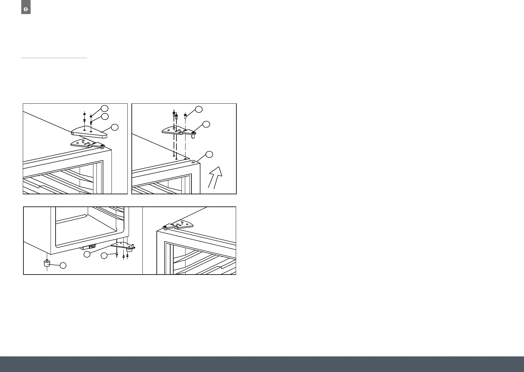 5. Install the lower hinge on the left side of the cabinet and fix with screws (7).