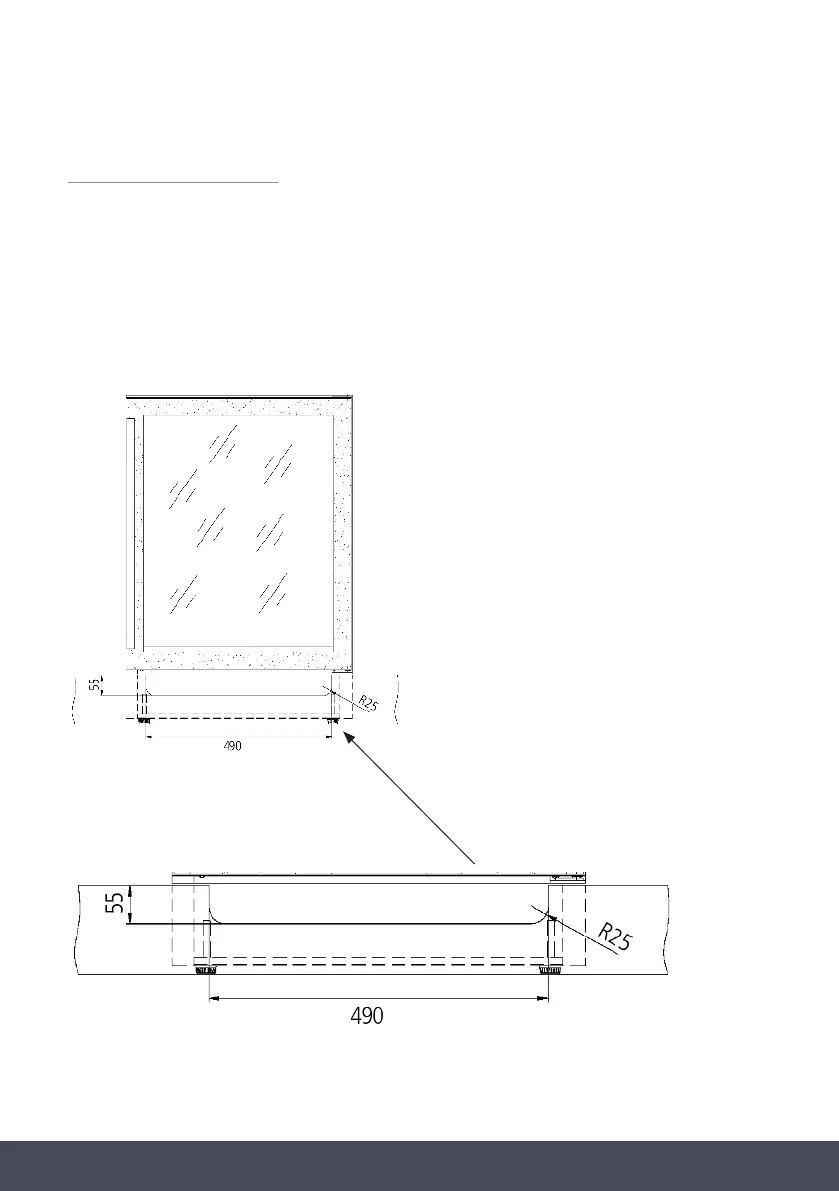 This model is recessed to t a kitchen plinth. A H55mm vent slot is required in the plinth