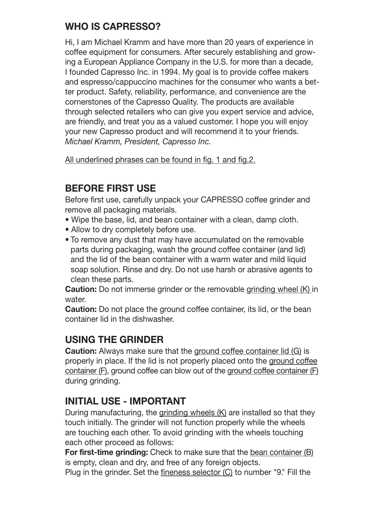 Before first use, carefully unpack your CAPRESSO coffee grinder and