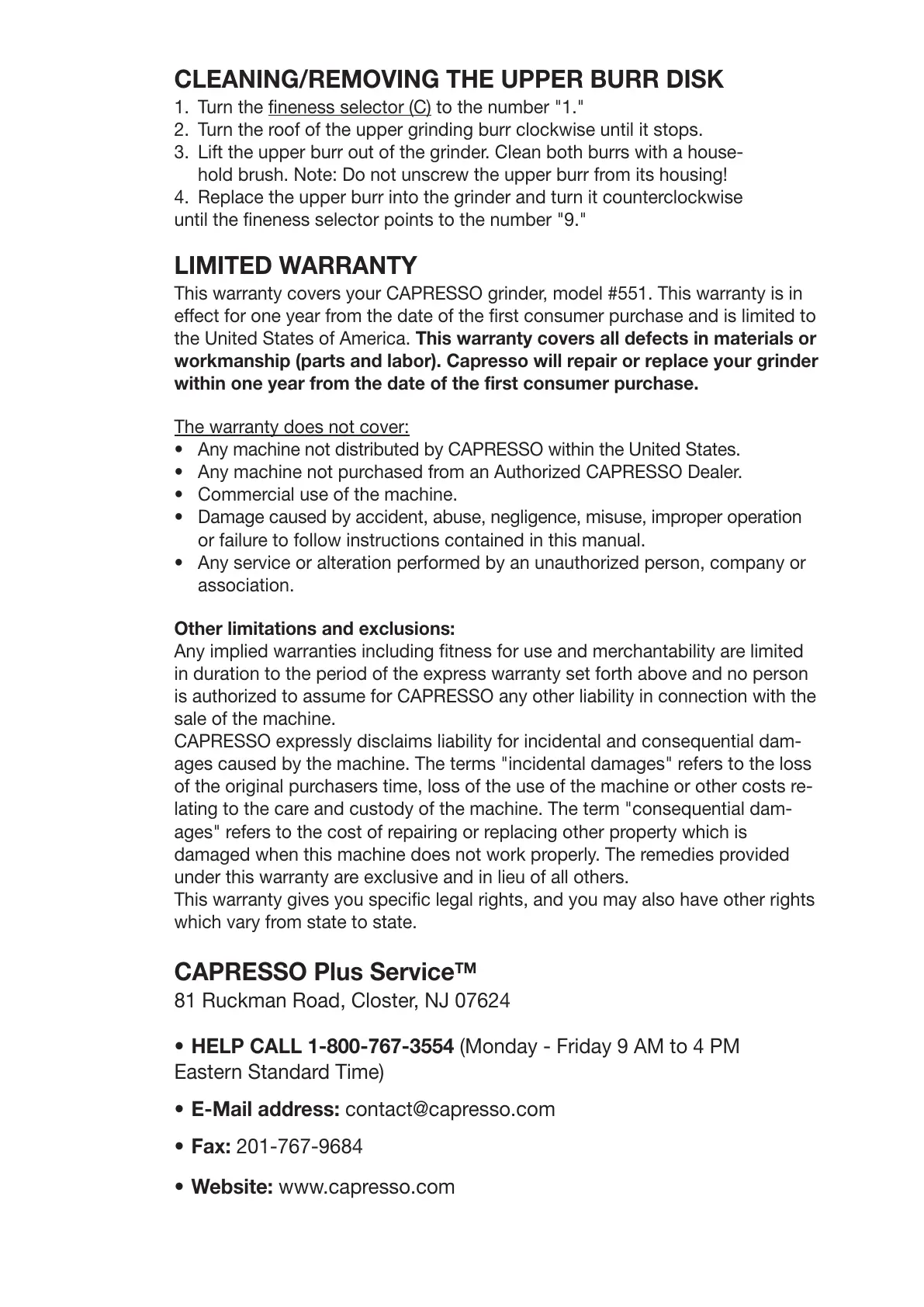 This warranty covers your CAPRESSO grinder, model #551. This warranty is in