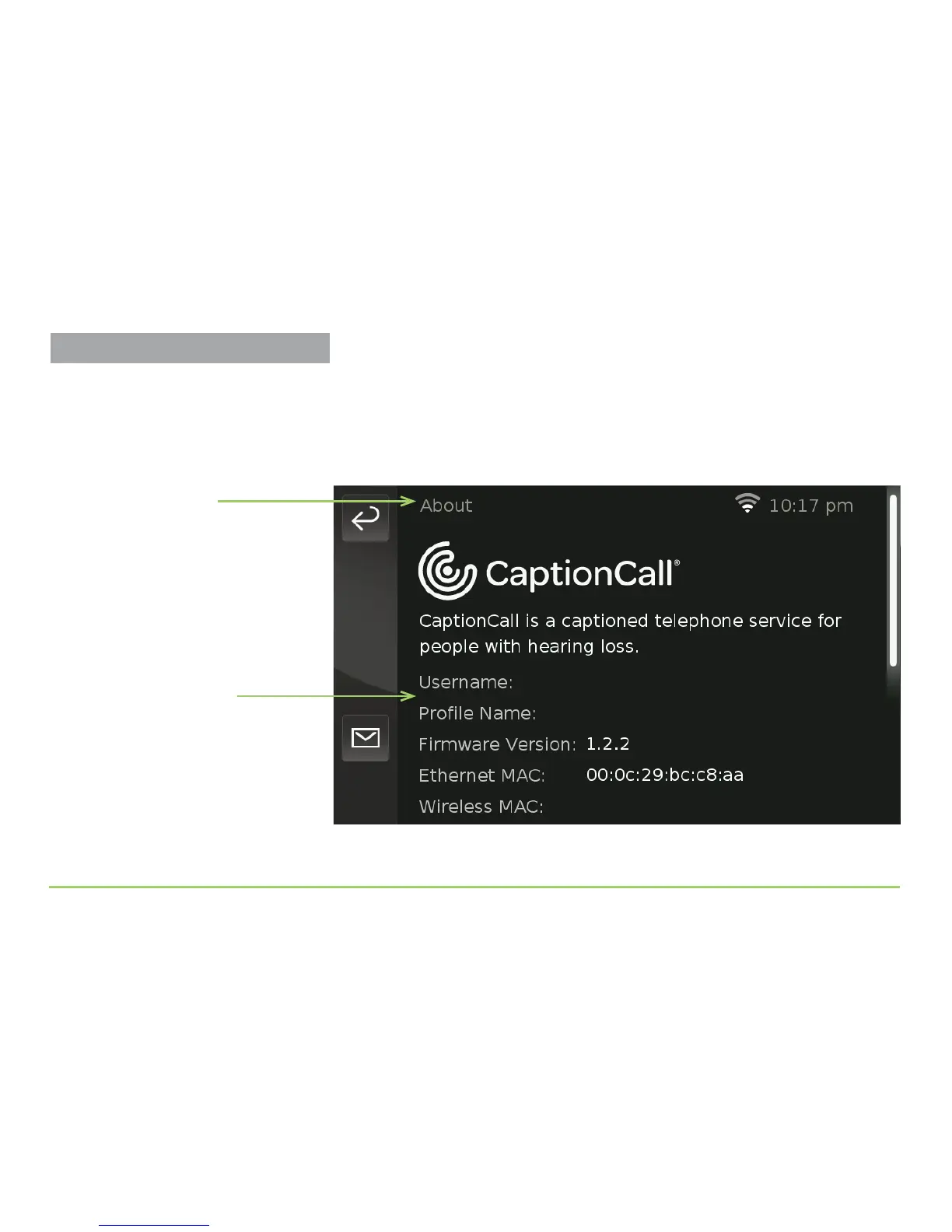 CaptionCall 57T - About Screen; List of information