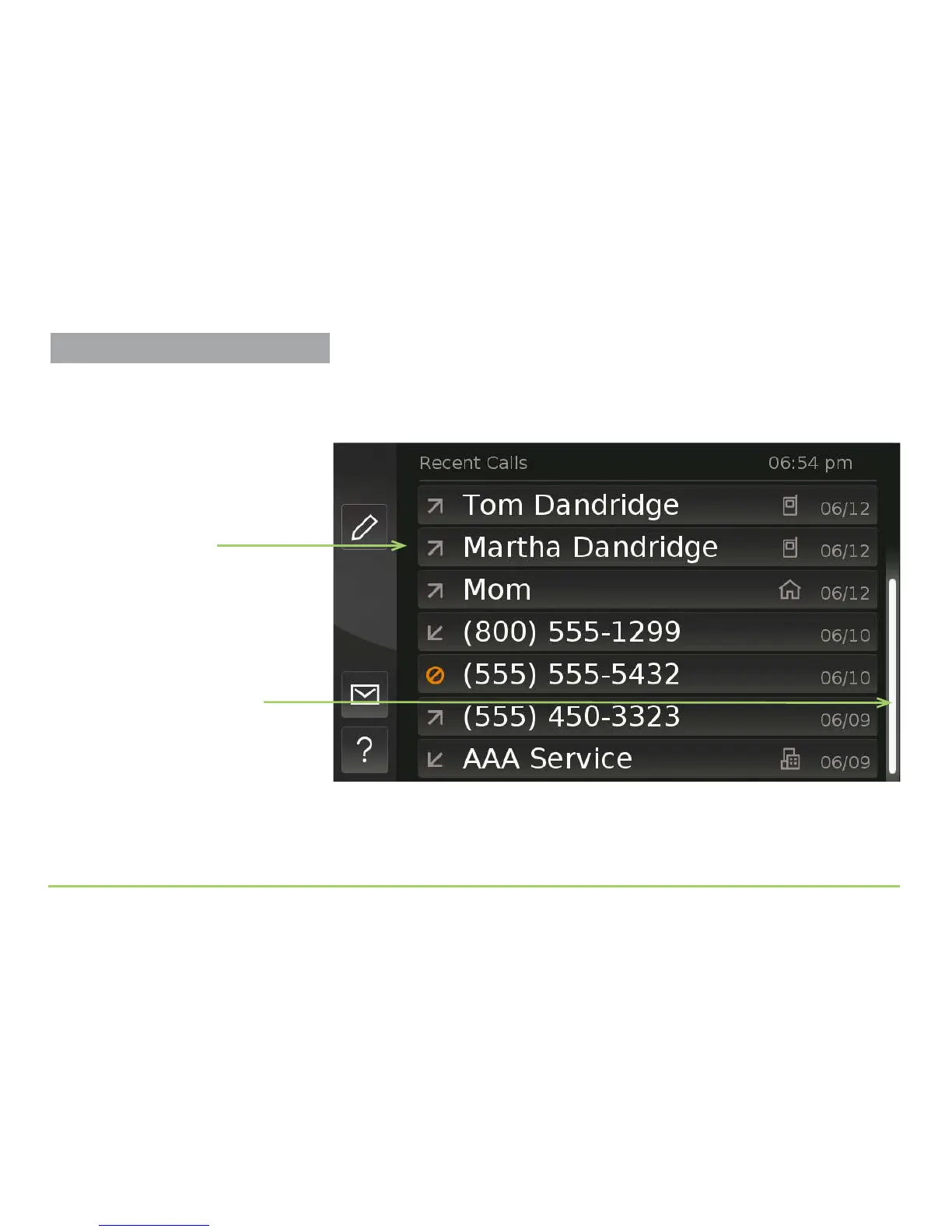 nger. e image below shows the Recent Calls screen scrolled upward.