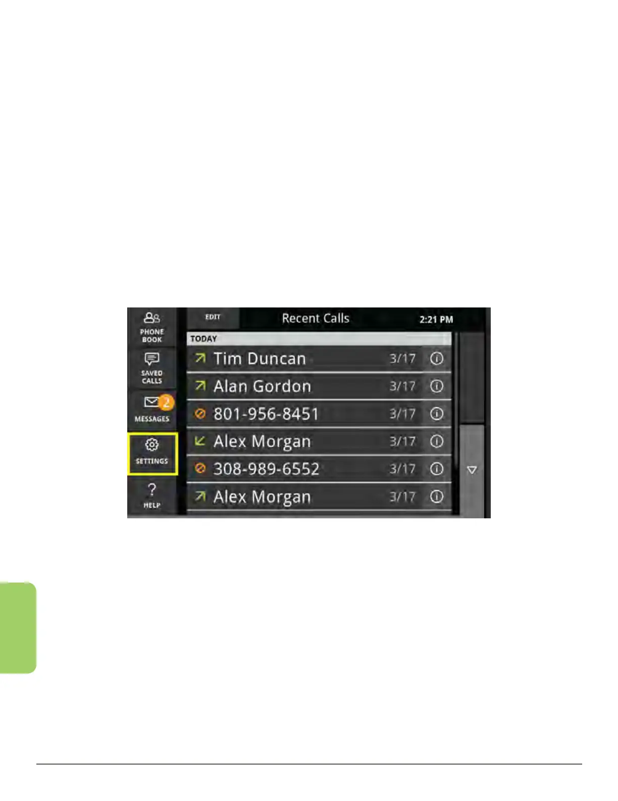 1. From the Recent Calls screen, press the Settings button in the lower left corner.