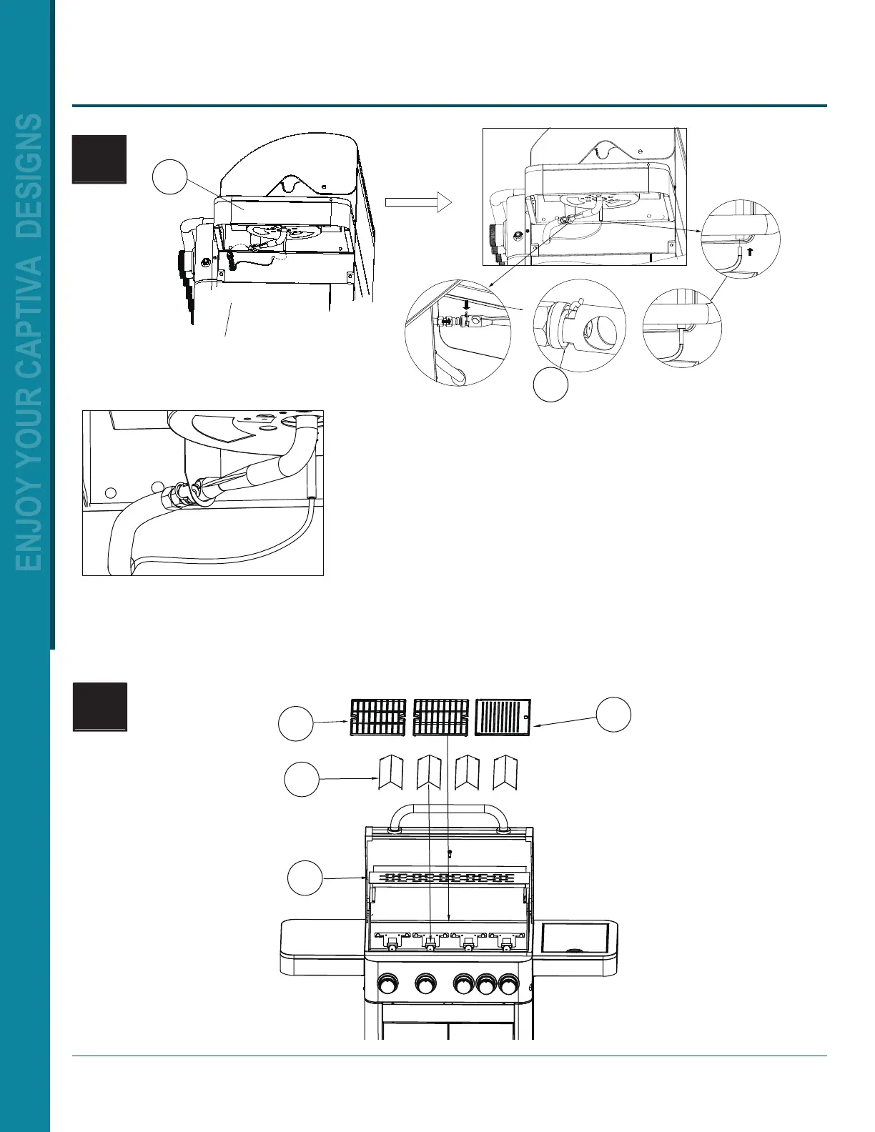 Captiva Designs E02GR022 - Step 14: Side Burner Gas Connection; Step 15: Grate and Heat Tent Placement