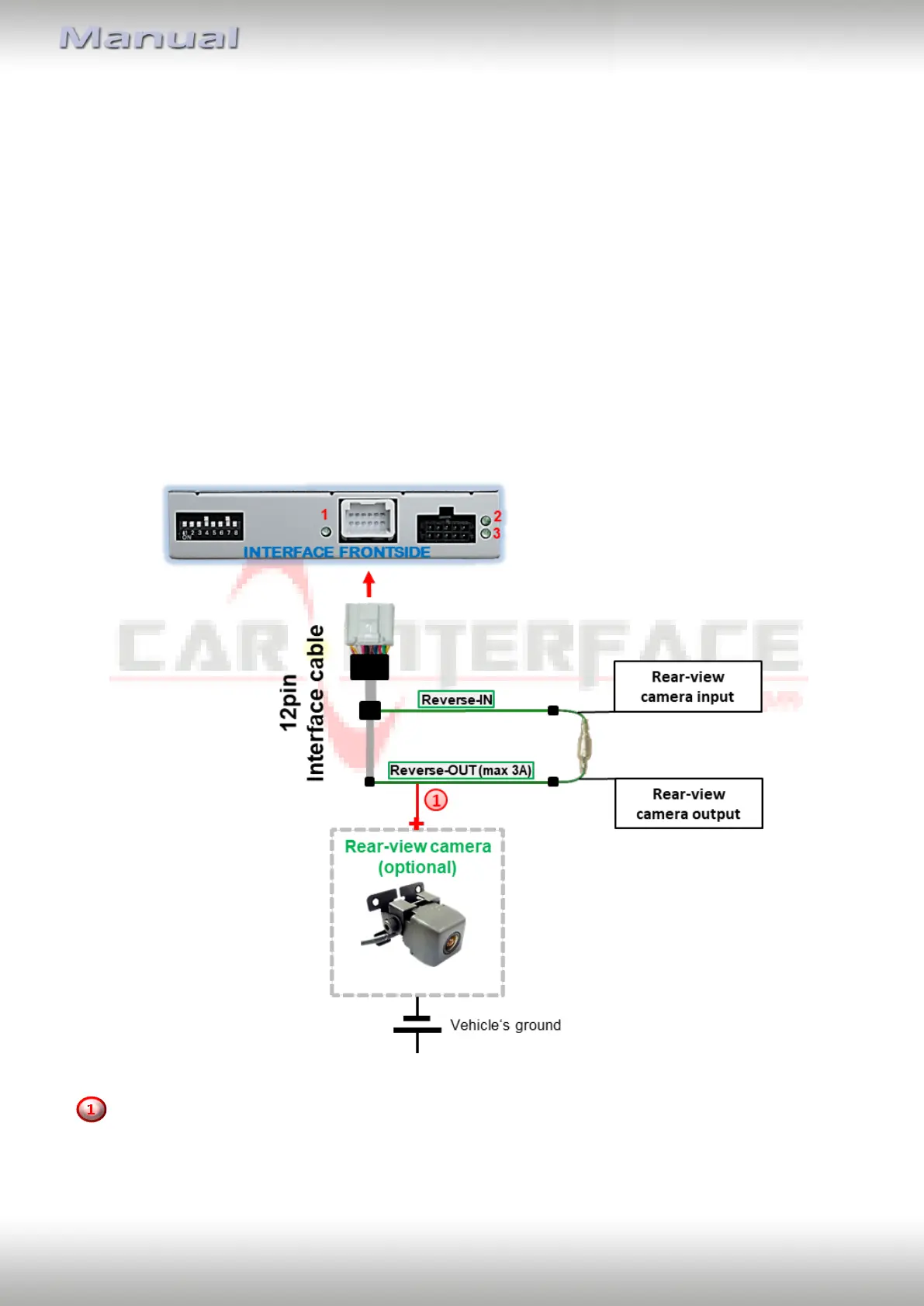 The 12 V power supply for the rear-view camera (max 3A) has to be taken from the 12pin