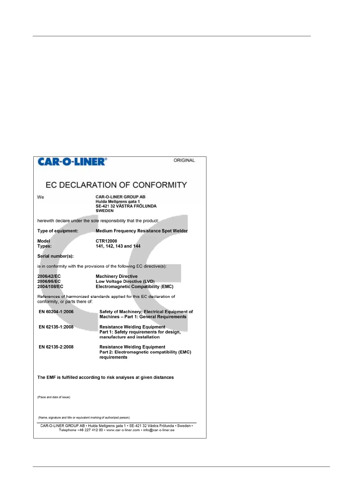 Below an example of how the EC Declaration of Conformity for the CTR12000 is outlined.