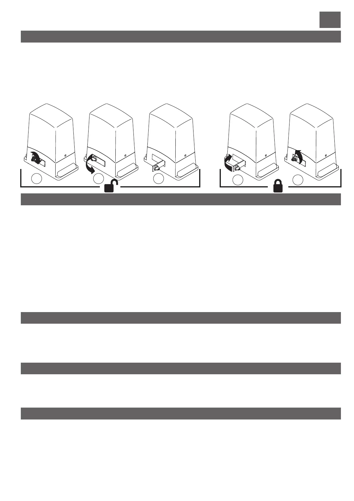 RELEASE: 1) insert the key and turn clockwise 2) pull the lever through approx. 90° 3) the motor is released and the leaf can