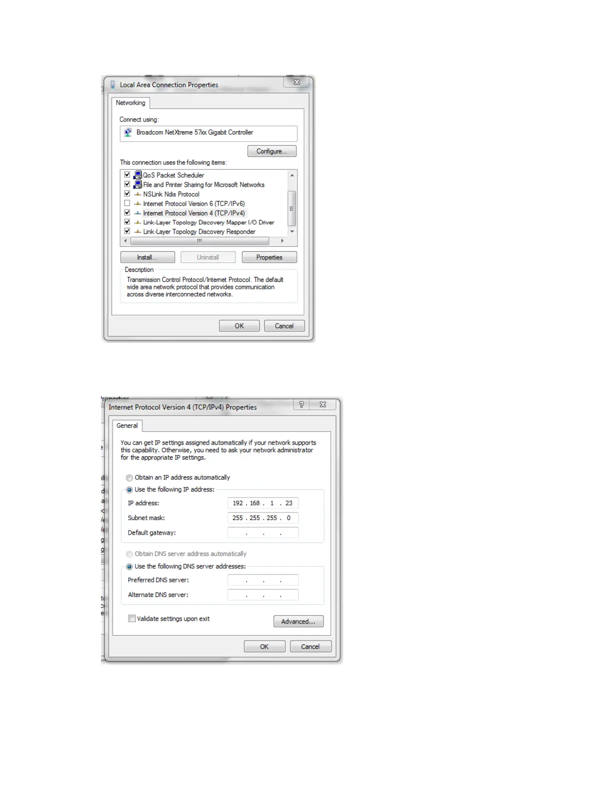 7. Click “Use the following IP address” and type the appropriate values as shown.