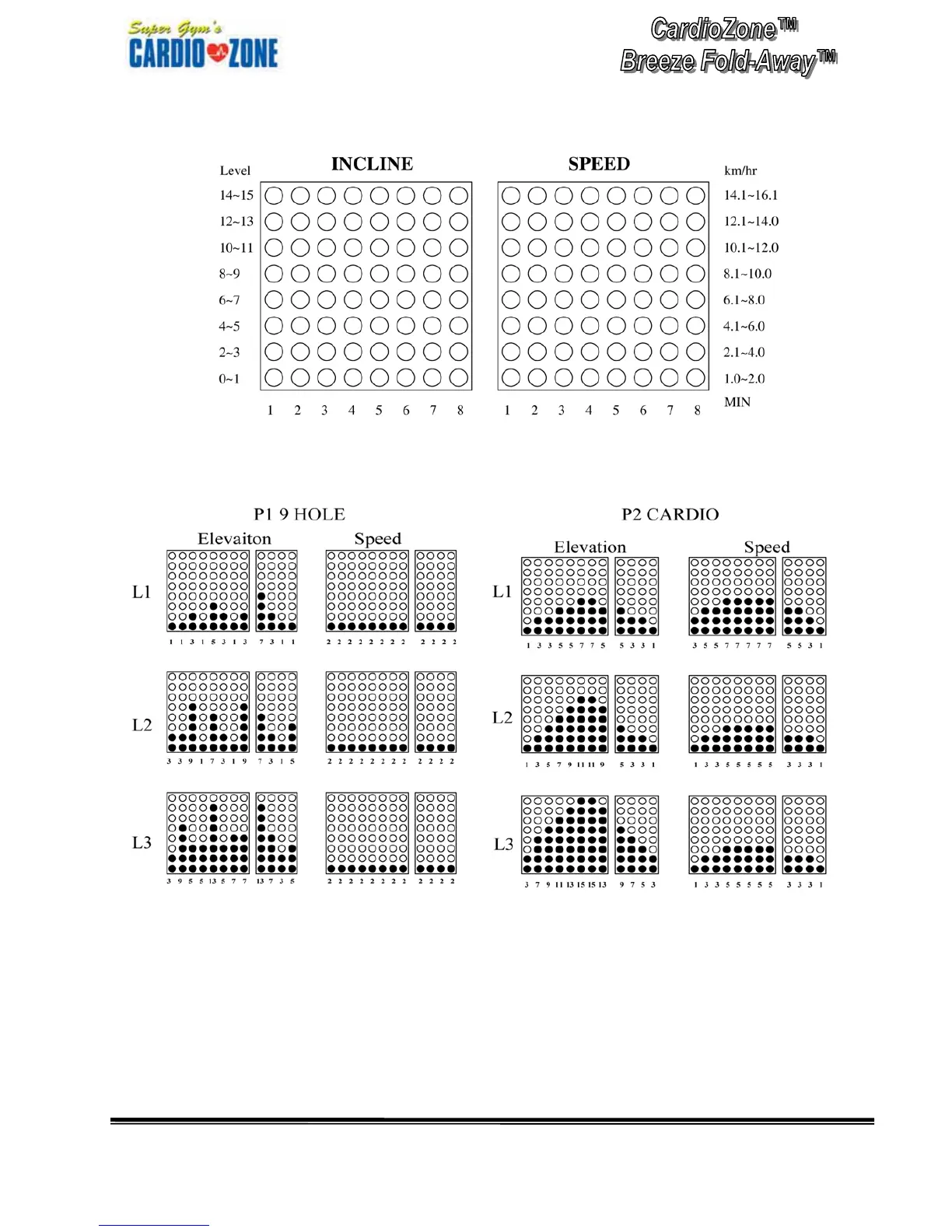 Cardio Zone Treadmill - P1 9 HOLE Program Parameters; P2 CARDIO Program Parameters