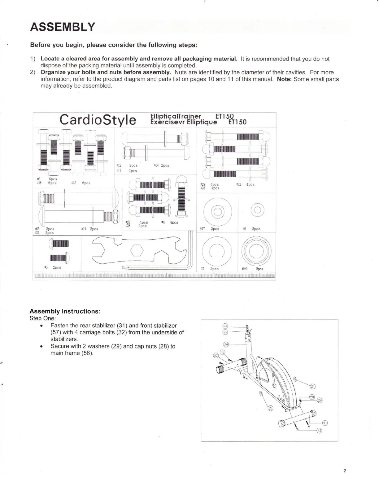 2) Organize your bolts and nuts before assembly. Nuts are identified by the diameter of their cavities. For more
