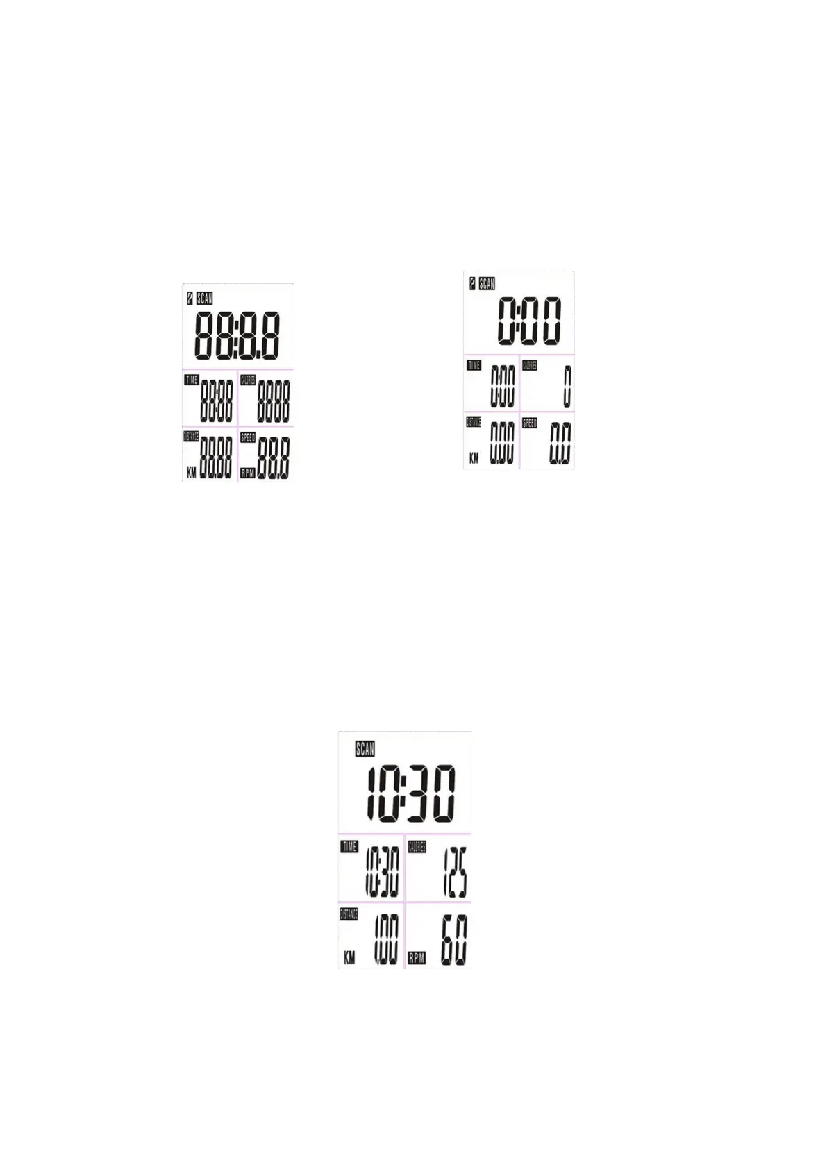 ZEIT/STRECKE/KALORIEN(RPM/GESCHWINDIGKEIT) in dieser Reihenfolge.