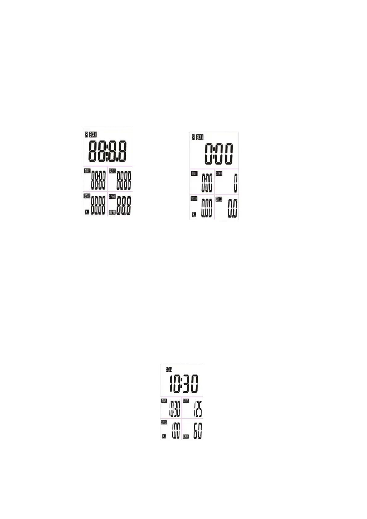 TIME/DISTANCE/CALORIES/(RPM/SPEED) cada 6 segundos. El orden es el siguiente.
