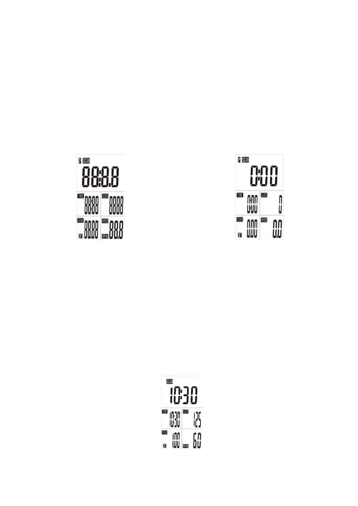 TIME/DISTANCE/CALORIES/(RPM/SPEED), met intervallen van 6 seconden achtereenvolgens