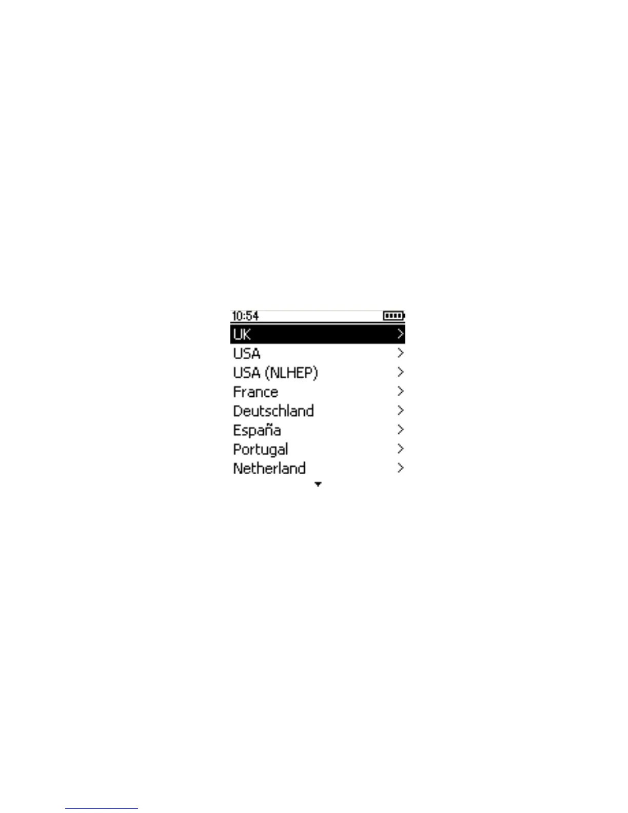 Use as setas para cima e para baixo para escolher o país pretendido e