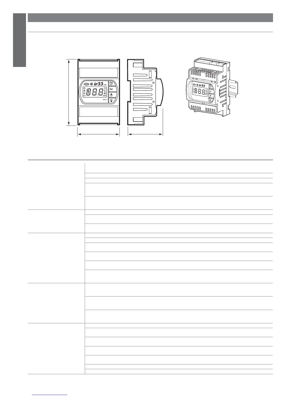 The dimensions of the ir33DIN are 60x111x70.4 mm for all versions, with the drilling template measuring 40x70 mm.
