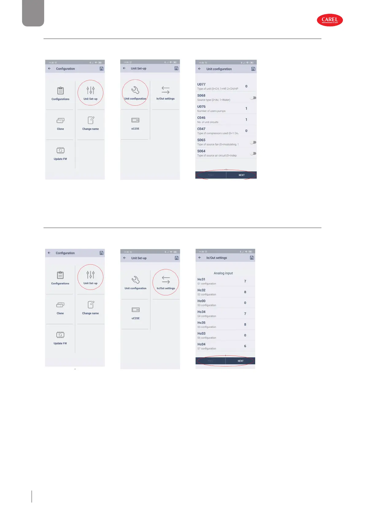 1. click “Set-up”--> “Unit setup” --> “IO confi guration”. Complete the unit confi guration by pressing the PREV / NEXT buttons to
