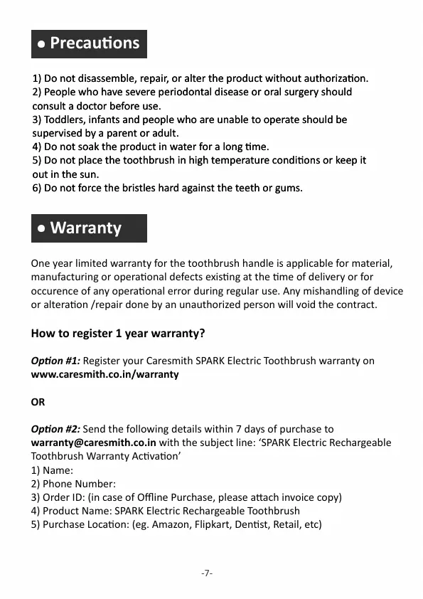 warranty@caresmith.co.in with the subject line: ‘SPARK Electric Rechargeable