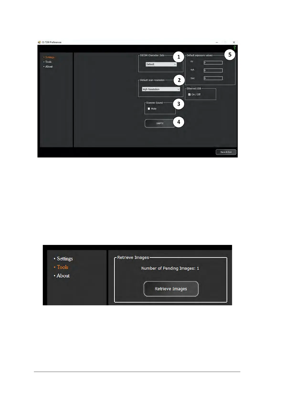 The tools tab enables the user to retrieve a scanned image in case the Dental Imaging Software crashed