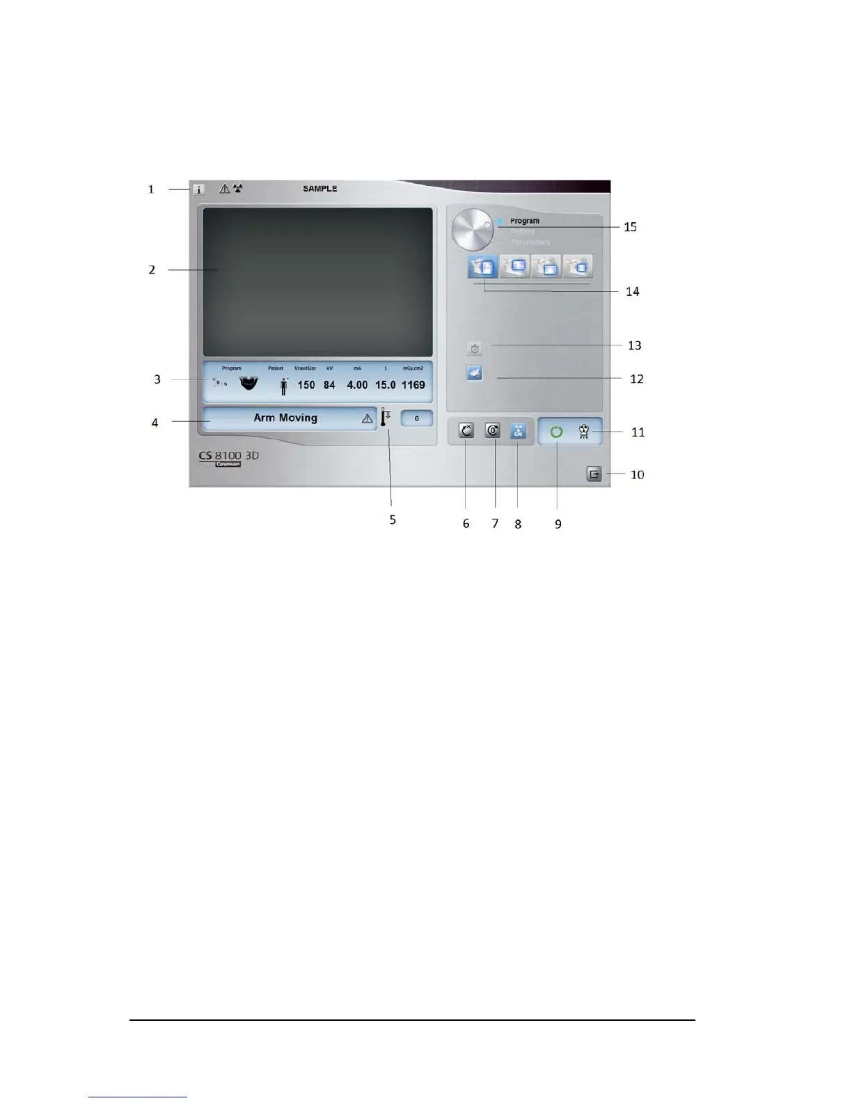 8 X-ray On/Off button: Enables or disables X-ray emission.