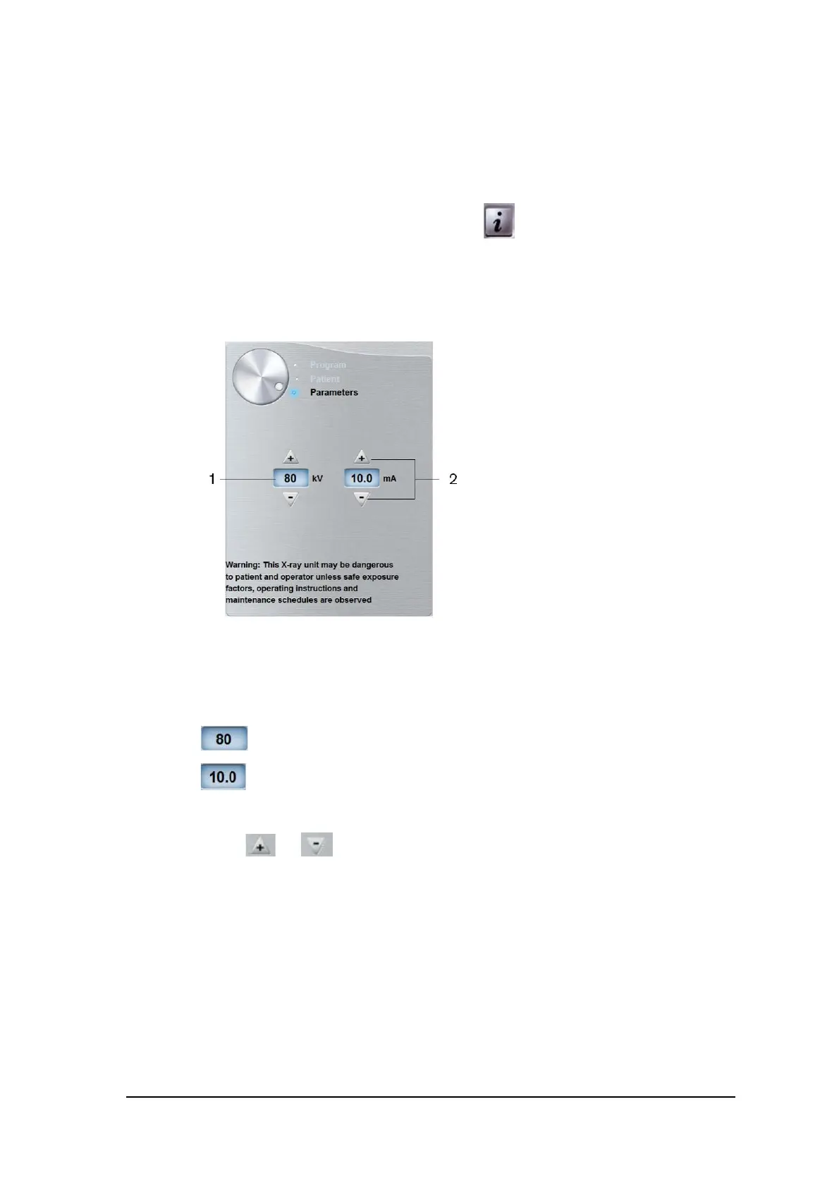Click or to fine-tune the kV and the mA.