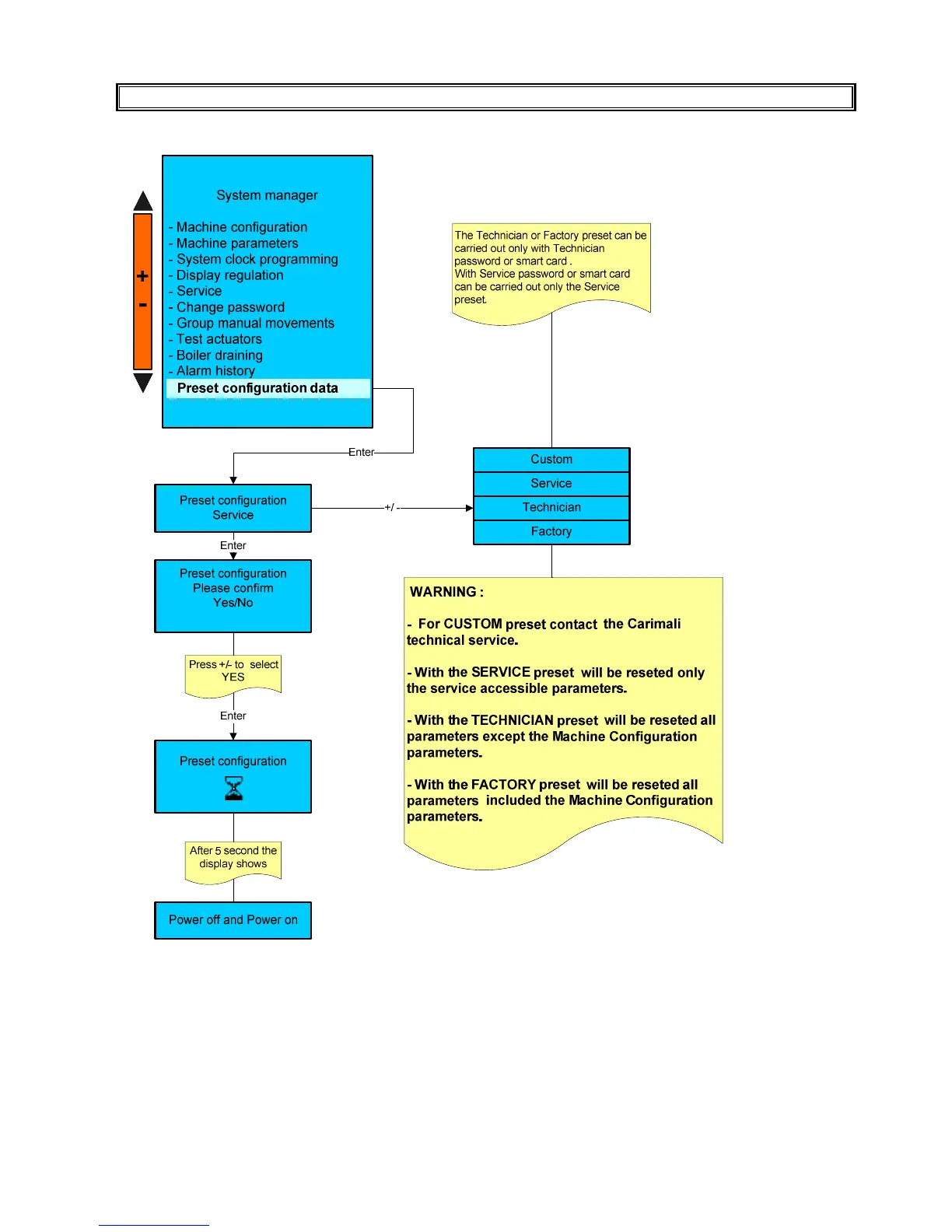 Carimali Multi Smart LM - PRESET PARAMETERS; Custom Preset; Service Preset; Technician Preset