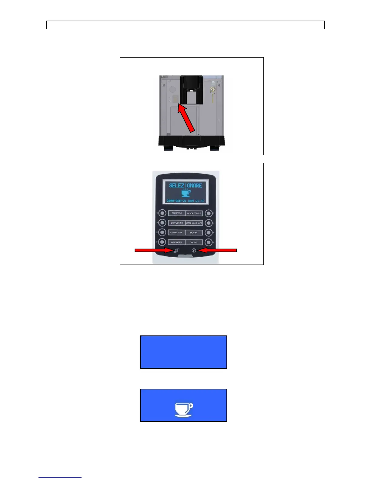 After checking that the machine door is closed and the drip tray are inserted, power ON the machine by means of the main switch inside