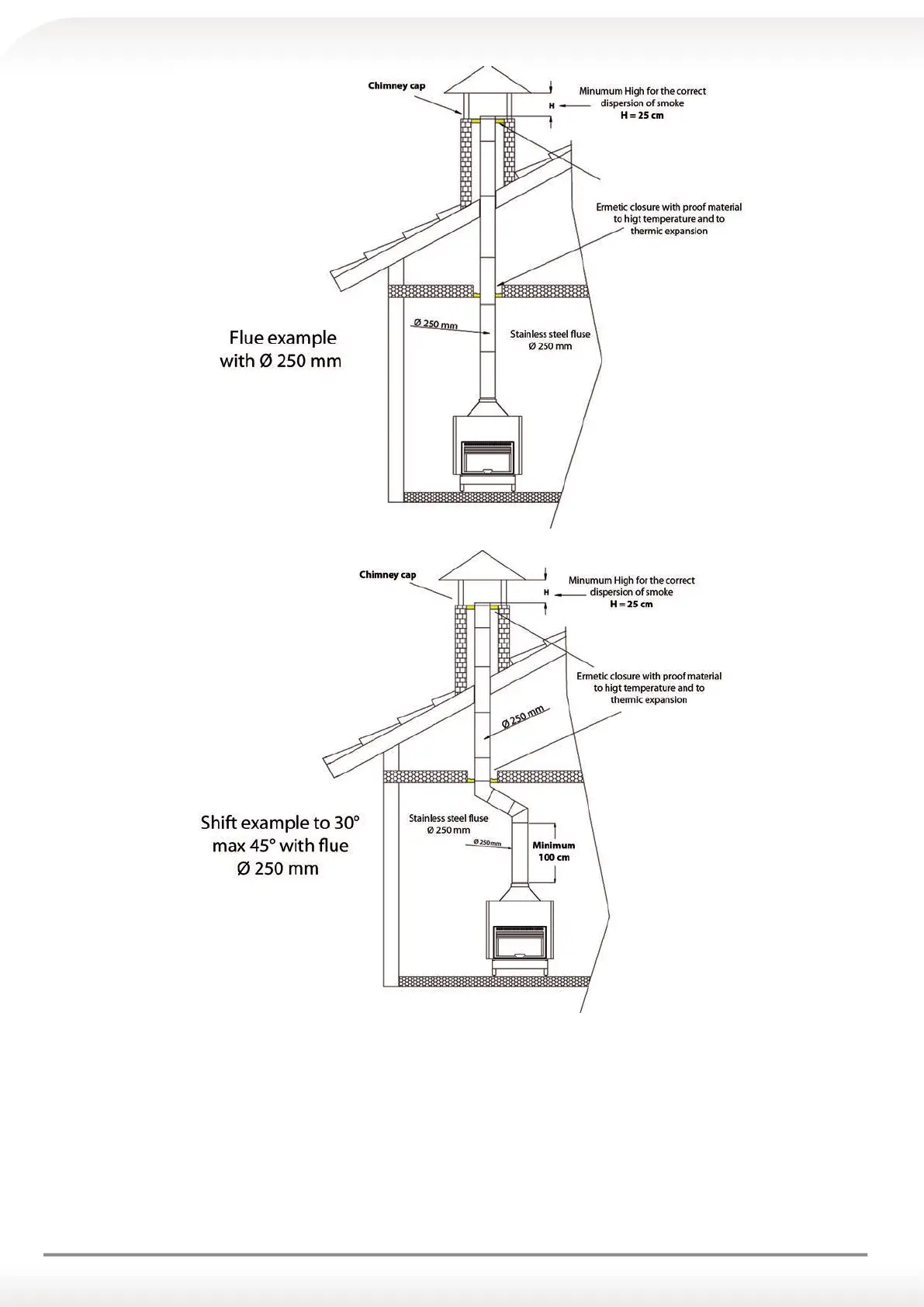It is necessary to install a chimney stack at the top of the flue to facilitate the dispersion of fumes.