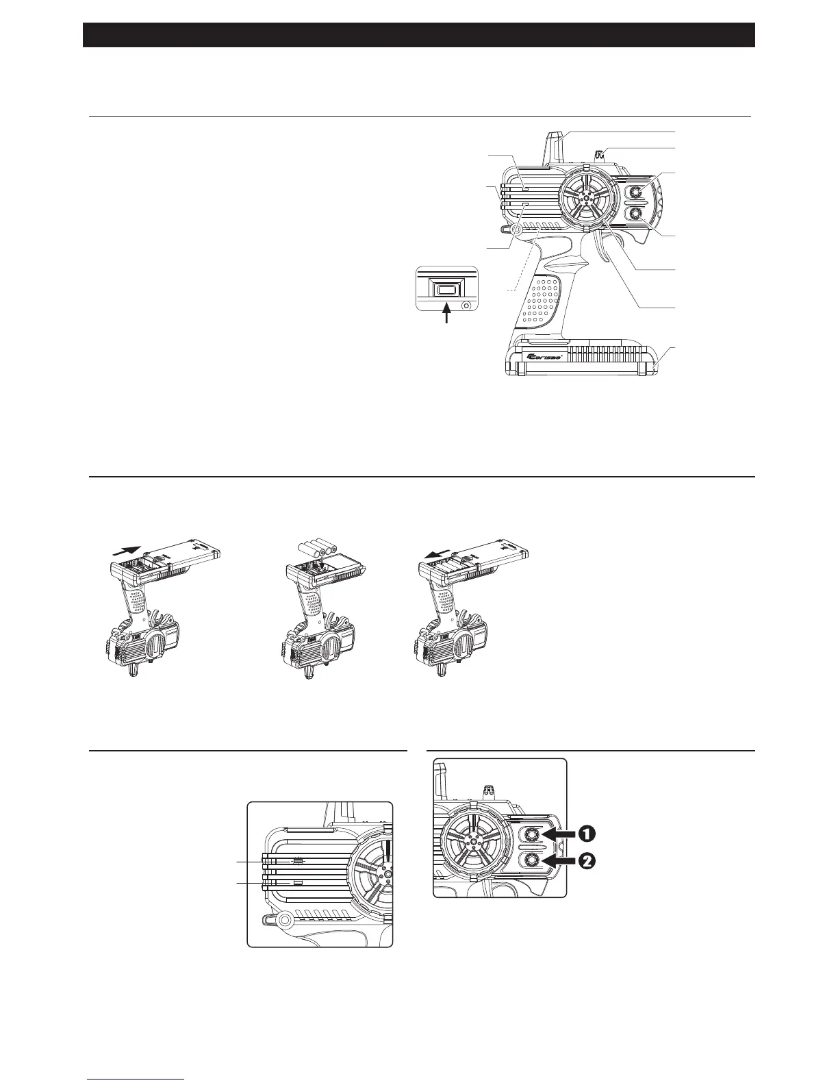 * Always turn on the transmitter first by sliding the switch on the left side from
