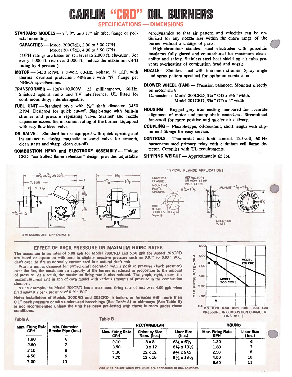 Carlin CRD Series - SPECIFICATIONS - DIMENSIONS; Effect of Back Pressure on Maximum Firing Rates; Back Pressure Impact on Firing Rate; Firing Rate vs. Pressure Graph