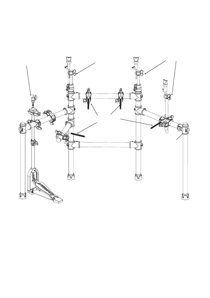 3. Place cymbal poles/Hi-Hat stand and L shape drum arms on the drum frame as illustrated.
