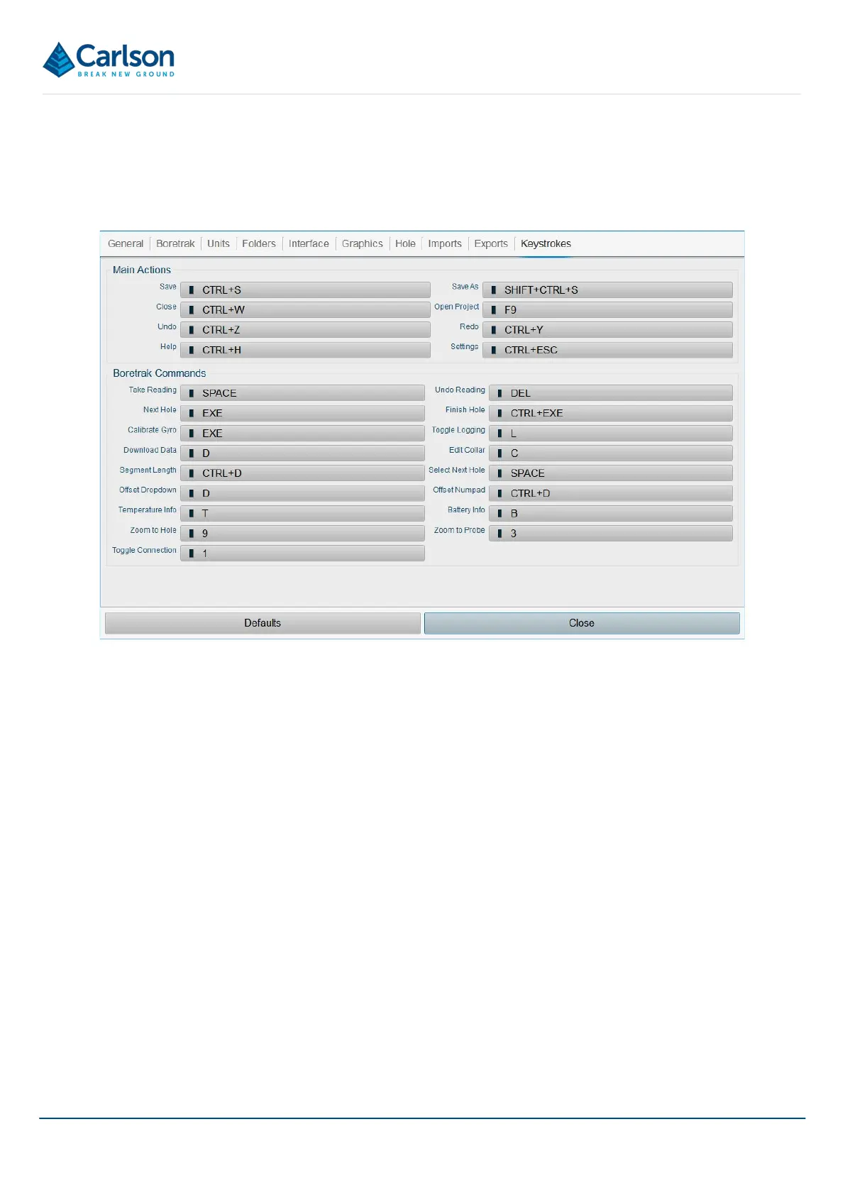 The Keystrokes tab lists common actions in Carlson Boretrak and allows you to assign shortcut keys to each of