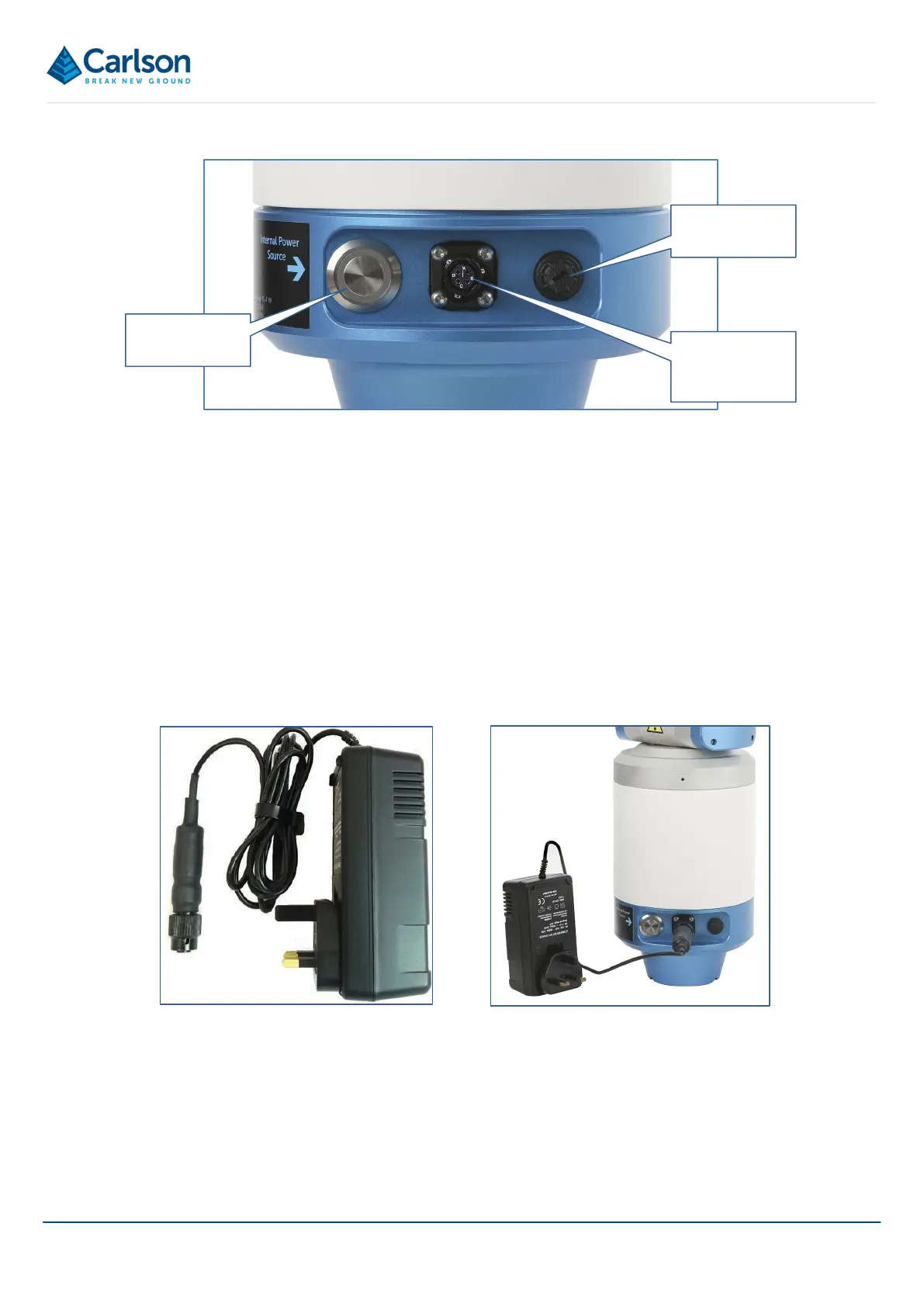 The battery is charged through the black, 4-pin female connector labelled Internal Power Source.
