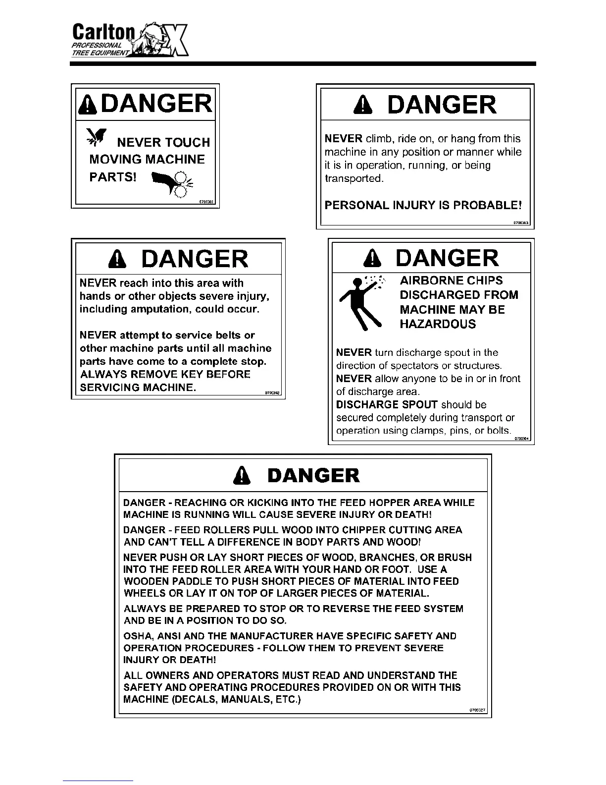 Carlton 2018 - CHIPPER SAFETY ALERT; DANGER NEVER TOUCH MOVING MACHINE PARTS!; DANGER AIRBORNE CHIPS DISCHARGED FROM MACHINE MAY BE HAZARDOUS