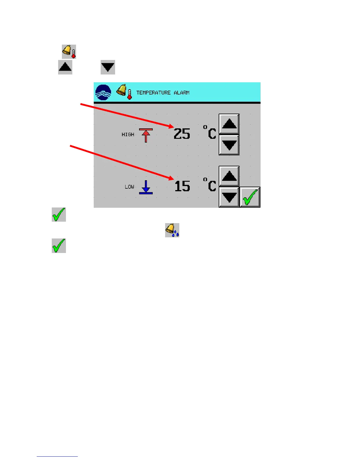 2. Use the (UP) and (DOWN) arrow buttons to set the high and low temperature alarms.