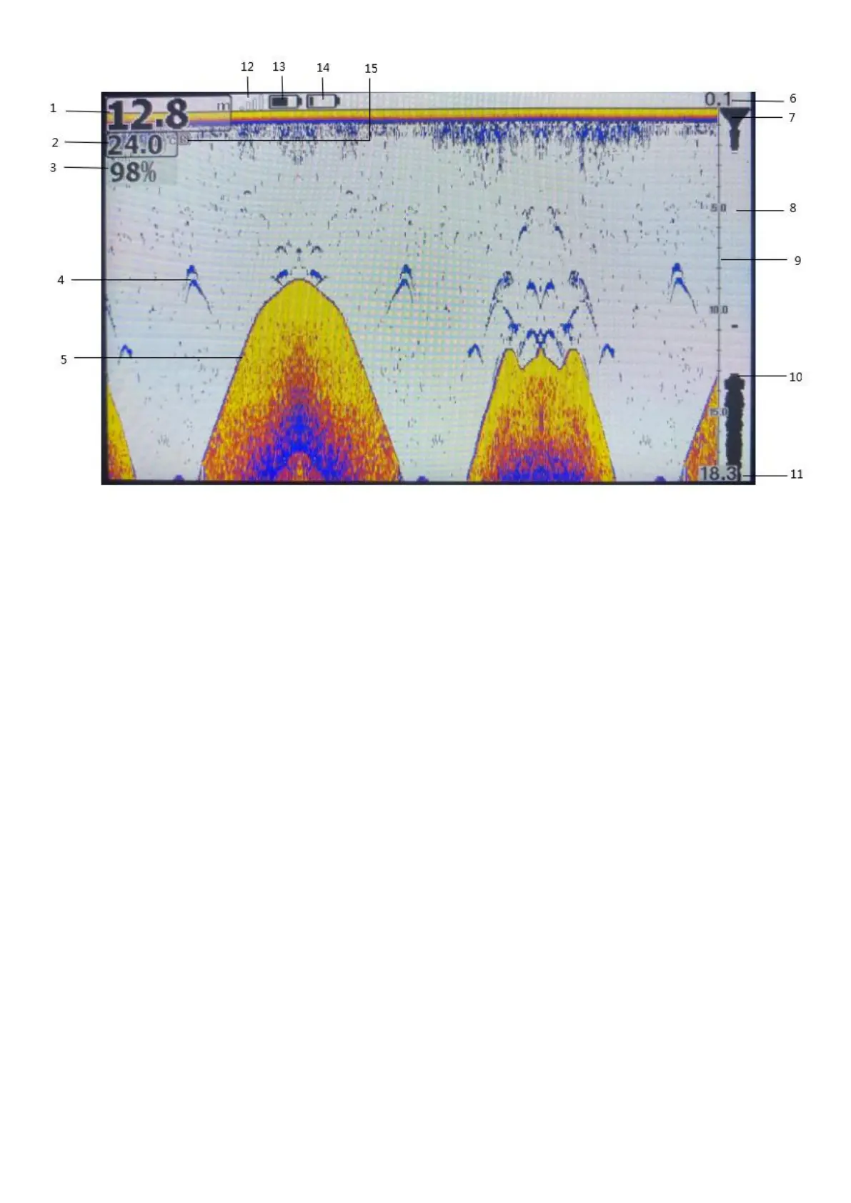display. The wider the horizontal line, the stronger the signal, and the depth at which the echo is located refers to the