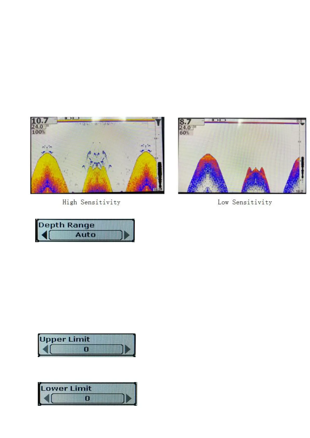 Press the On/Off key to select the "Sonar" menu group, press the up/Down key to select the depth range item, and