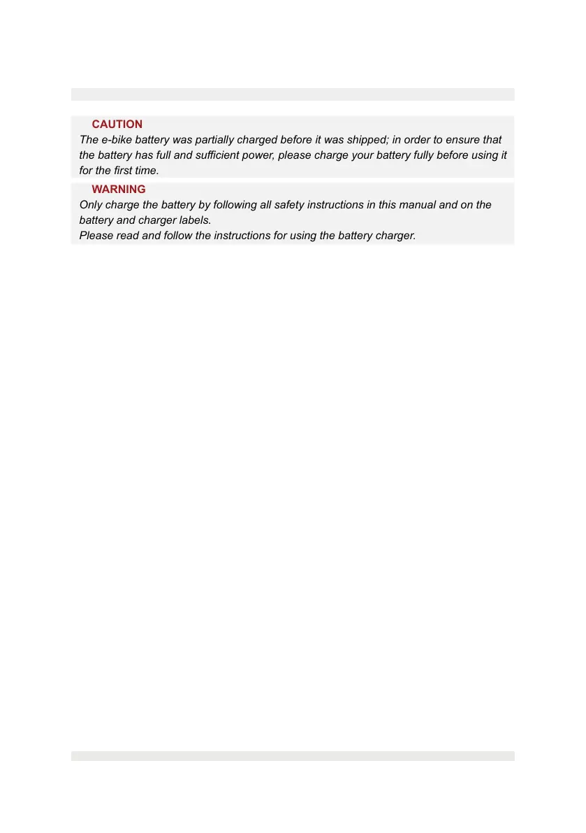 • Do not try to use the e-bike or charge the battery if the location where the battery is
