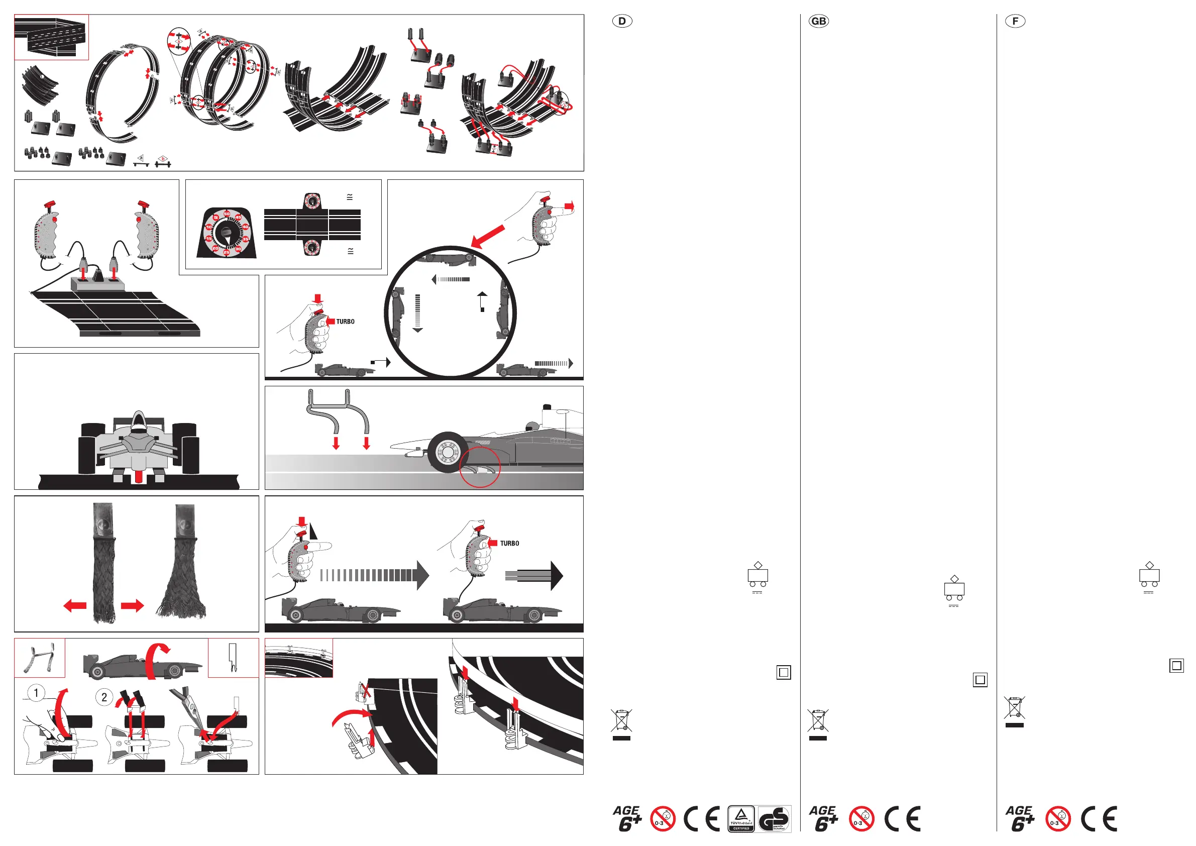 purely for the purposes of the instructions. For package contents see parts list. · F IMPORTANT ! Les éléments de décoration et les véhicules Carrera sont représentés sous forme de figures symboliques, uniquement à des fins d‘instruction. Pour le contenu de