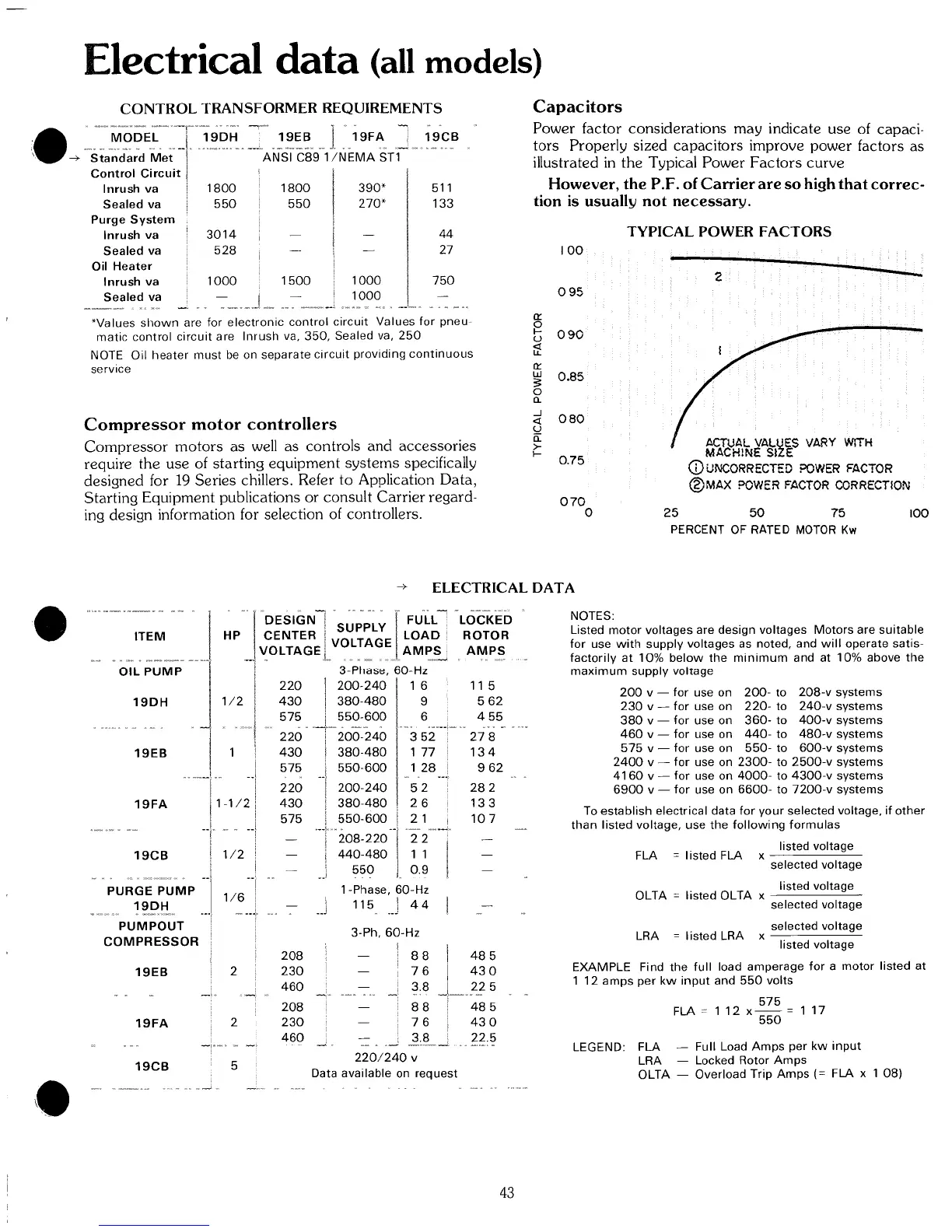 Carrier 19 - Electrical Data (All Models); Compressor Motor Controllers; Capacitors; Typical Power Factors