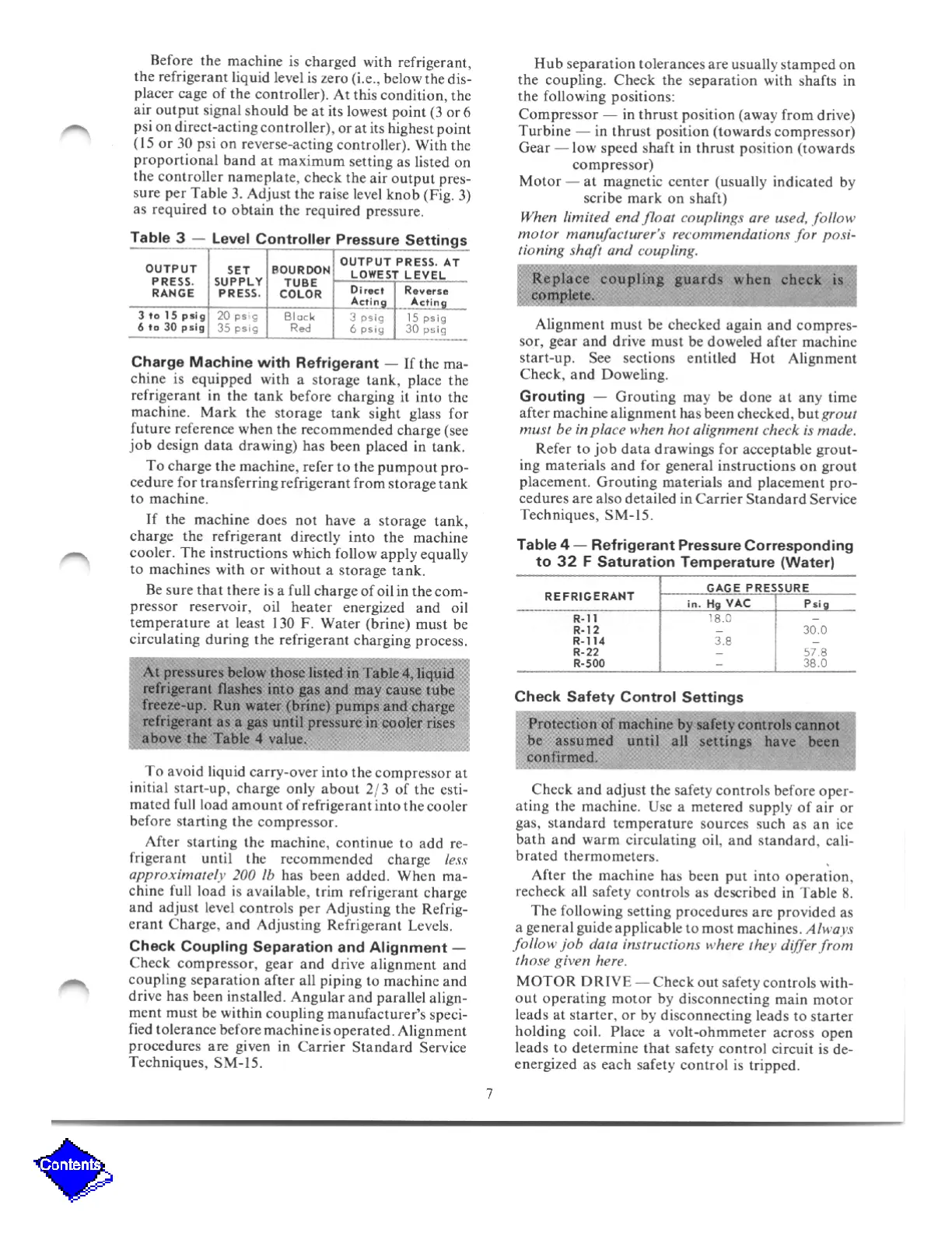 Carrier 19EA - Refrigerant, Alignment, and Safety Controls; Refrigerant Charging and Alignment Checks; Grouting and Safety Control Settings