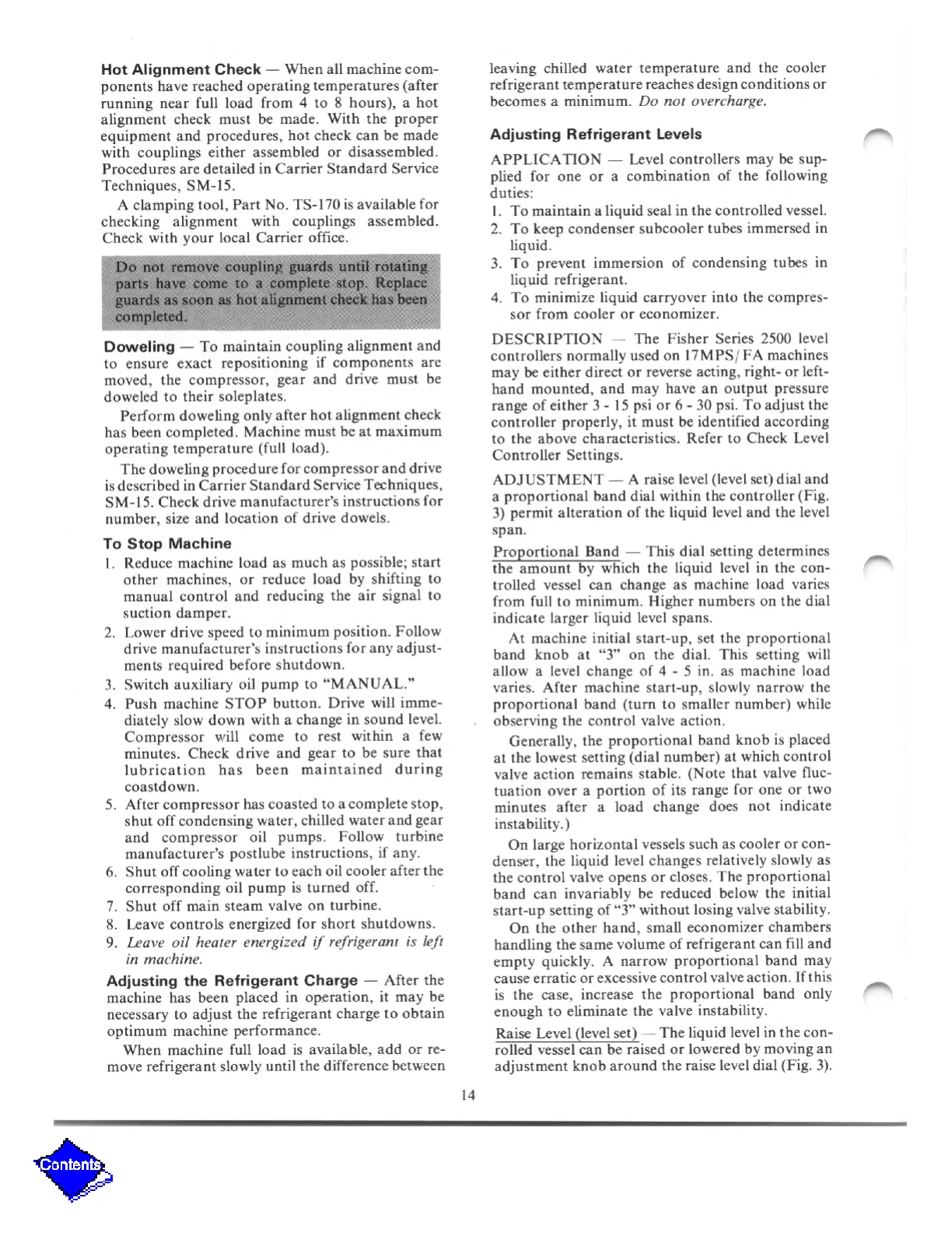 Carrier 19EA - Machine Alignment, Shutdown, and Adjustment; Machine Stopping Sequence and Refrigerant Adjustment