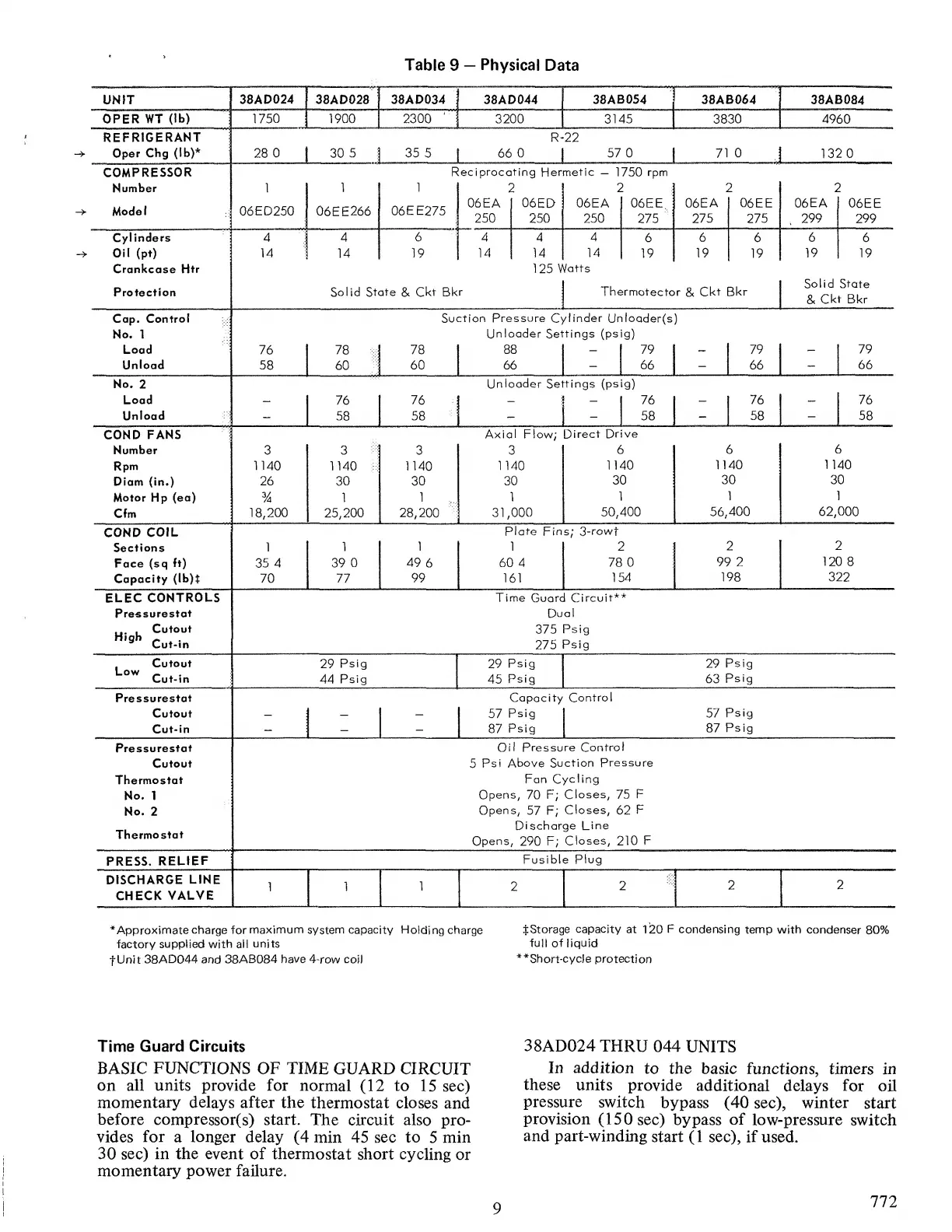 Carrier 38AD - Unit Physical Data Summary; Time Guard Circuit Functions