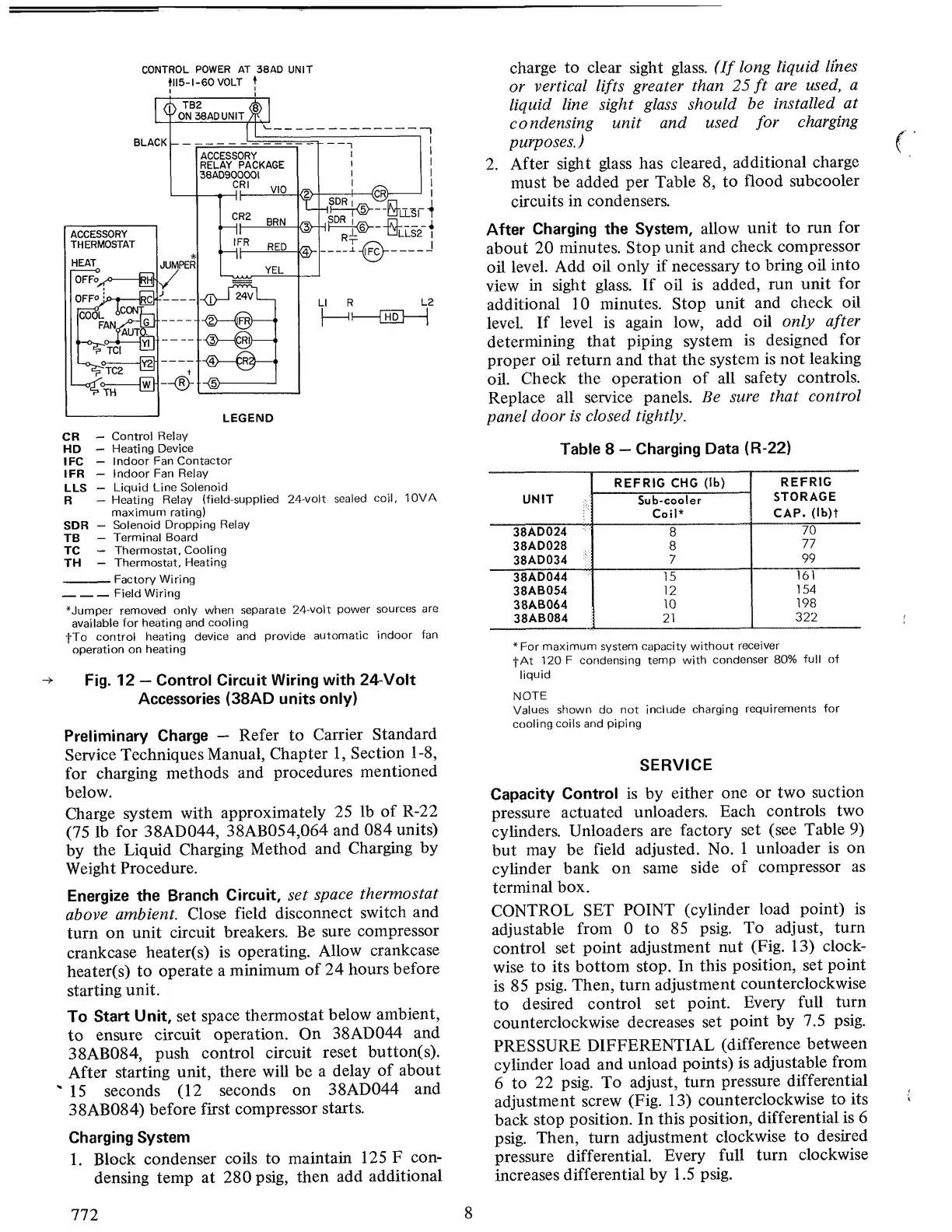 Carrier 38AD034 - Refrigerant Charging and Capacity Control; Refrigerant Charging Method; Refrigerant Charging Data; Capacity Control Valve Adjustment