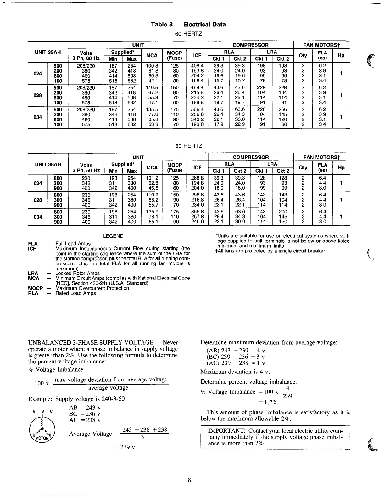 Carrier 38AH024-034 - Electrical Data; Unbalanced 3-Phase Supply Voltage