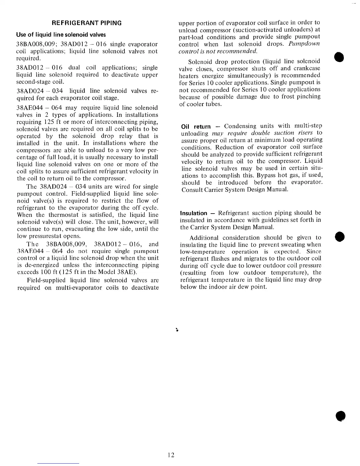 Carrier 38BA - REFRIGERANT PIPING AND OIL RETURN; Use of liquid line solenoid valves; Oil return; Insulation